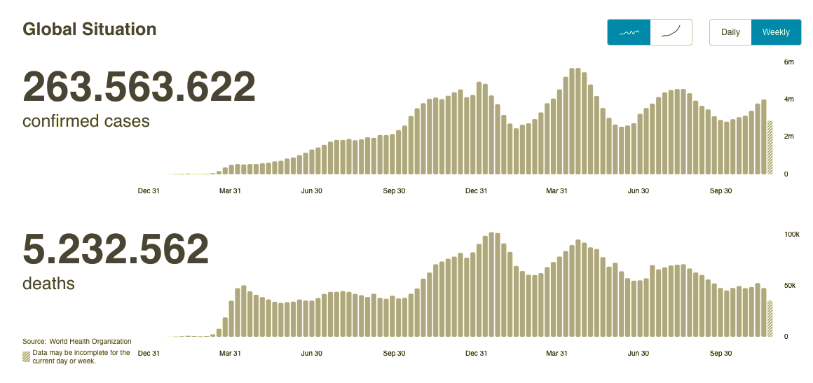 Das Thema Corona wird die Welt auch 2022 bewegen. Wird in eine Pandemie hineingeimpft, werden Mutationen ausgelöst. Derzeit belastet die Corona-Mutante Omikron. Saisonal ergeben sich in den kalten Jahreszeiten verschärfte Infektionsszenarien, die sich durch Gegenmaßnahmen und dem jahreszeitlichen Wechsel abschwächen werden. Mutationen schwächen sich in ihrer Gefährlichkeit im Zeitverlauf grundsätzlich ab. Ausnahmen bestätigen die Regel. Entsprechend ist verantwortliches Handeln gefragt. Pandemien sind nachweislich endliche Herausforderungen. Per 1. Dezember 2021 ergab sich global laut WHO folgendes Bild: