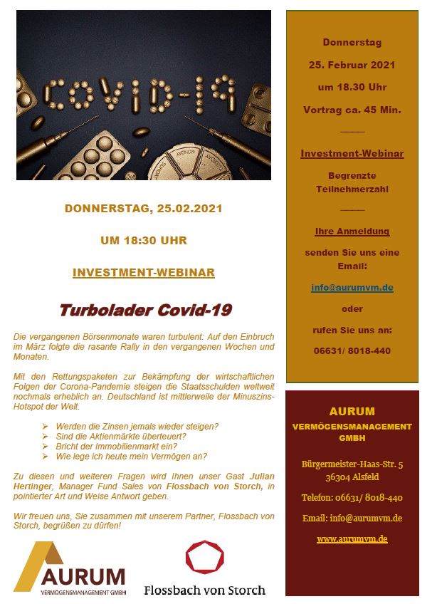 Antworten hierzu erhalten Sie in unserem Investment-Webinar mit unserem Partner, dem renommierten Vermögensverwalter Flossbach von Storch. Sie können sowohl online als auch telefonisch teilnehmen. Für weitere Informationen treten Sie bitte mit uns in Kontakt.