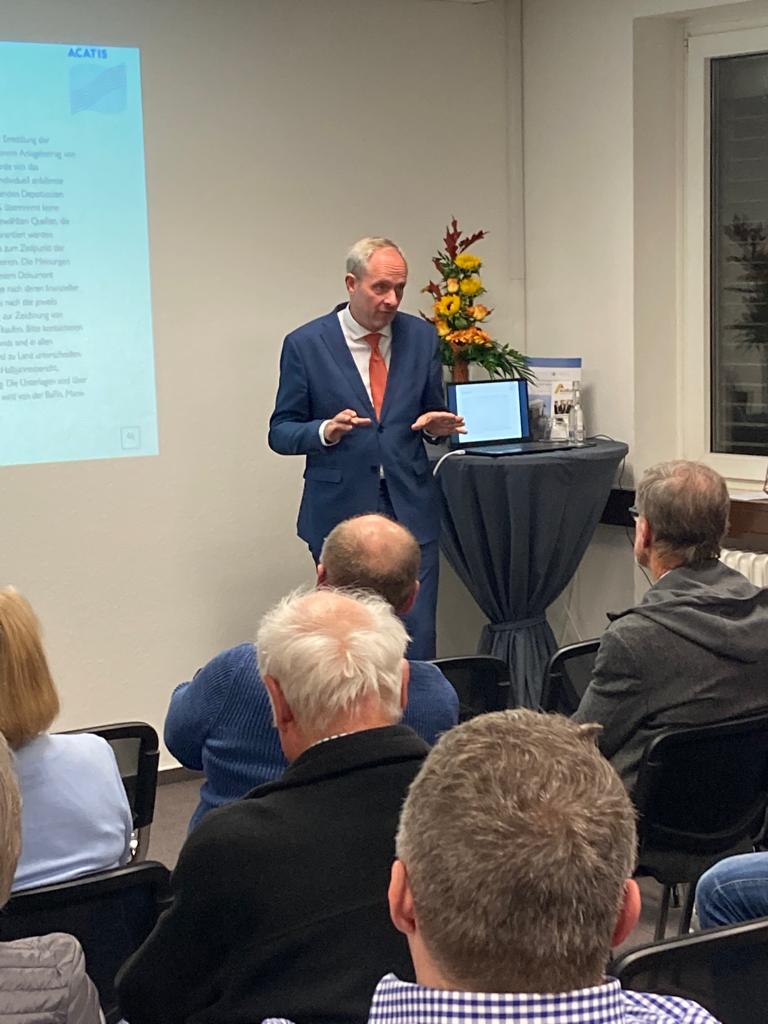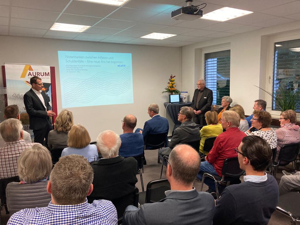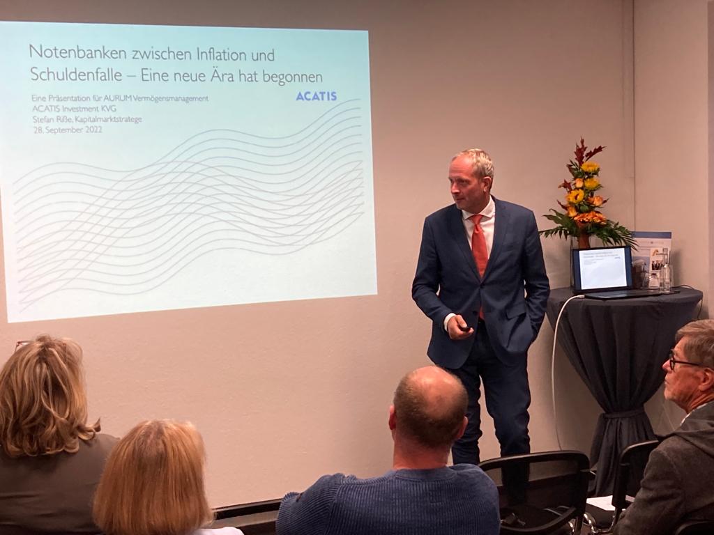 Was bedeutet das für Anleger und wie kann das eigene Vermögen geschützt werden?“ referierte Stefan Riße, Kapitalmarktstratege von Acatis Investment aus Frankfurt a.M. Acatis Investment, Frankfurt Main, ist einer der renommiertesten inhabergeführten Asset-Manager Deutschlands. Stefan Riße, sehr bekannt durch seine Interviews bei namhaften Nachrichtensendern wie NTV oder als Bestsellerautor.